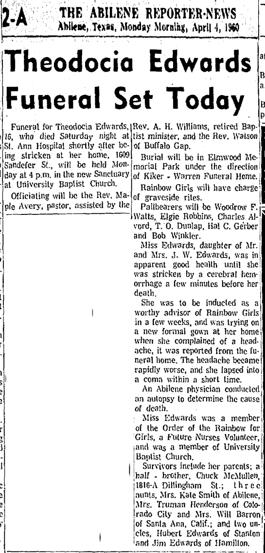 Theodocia EDWARDS [26 Dec 1943 - 2 Apr 1960] [ from cerebral hemorrhage; Junior year AHS (age 16)] Burial: Elmwood Memorial Park.